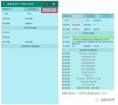 5、充值成功后將燃?xì)饪ㄐ酒虏迦胨{(lán)牙讀卡器中,點(diǎn)擊寫(xiě)卡可將儲(chǔ)存余額轉(zhuǎn)充成氣量。(如顯示寫(xiě)卡不成功,可再次點(diǎn)擊寫(xiě)卡重試,轉(zhuǎn)氣時(shí)不能關(guān)閉藍(lán)牙。)