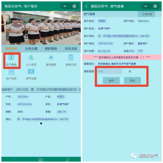 3、進(jìn)入主頁(yè)面點(diǎn)擊用氣繳費(fèi)進(jìn)行氣費(fèi)儲(chǔ)存。(普通機(jī)表直接繳費(fèi)即充值成功)